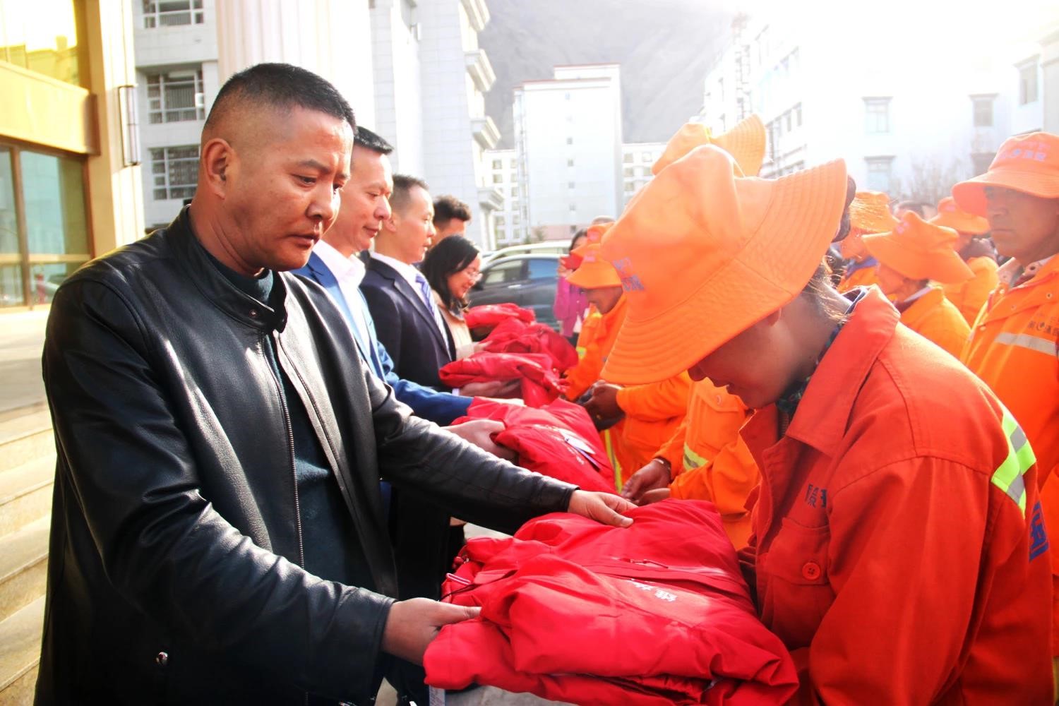 乃东区副区长格桑罗布、乃东区住房和城乡建设局局长张俊、国策公司负责人次仁旺庆应邀参加活动,并共同为环卫工人发放了保暖御寒的崭新环卫工装。